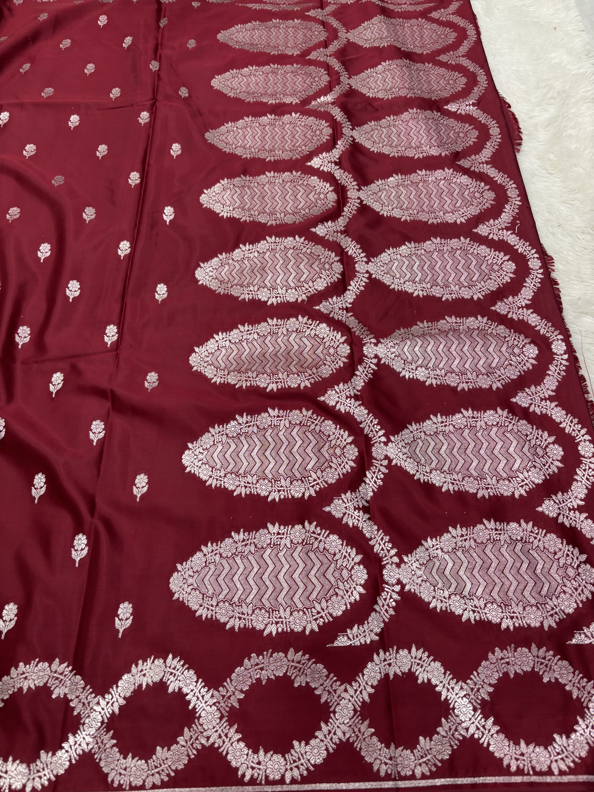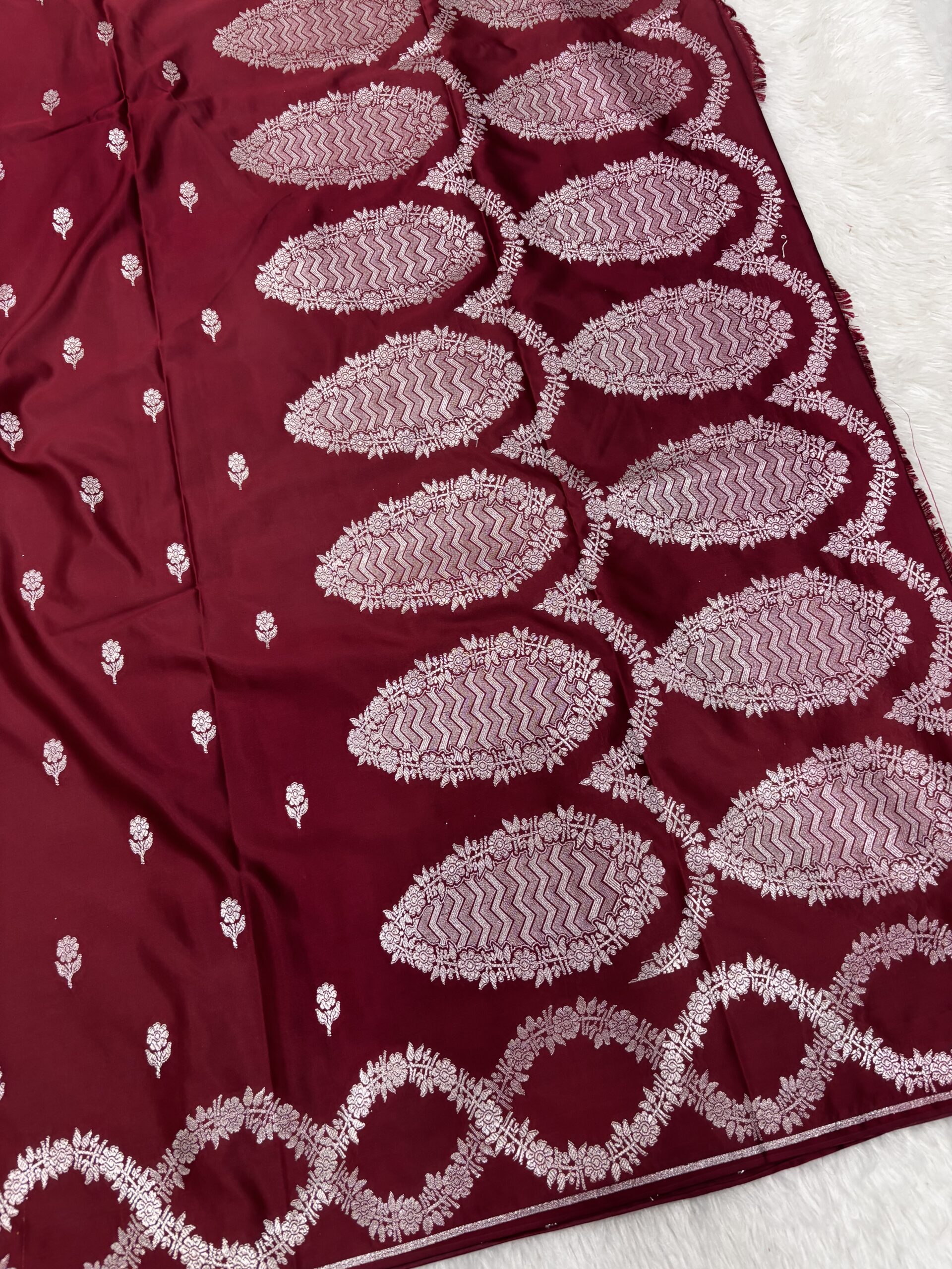 Embrace timeless elegance with this stunning Banarasi Maroon Mashru Silk Saree, meticulously crafted from premium Mashru Silk. Known for its opulent luster and buttery-smooth texture, Mashru silk offers a perfect blend of luxury and comfort, making it a must-have for every ethnic wardrobe. The craftsmanship of this Banarasi Maroon Shade Mashru Saree reflects the rich heritage of Indian weavers and is perfect for high-end occasions.