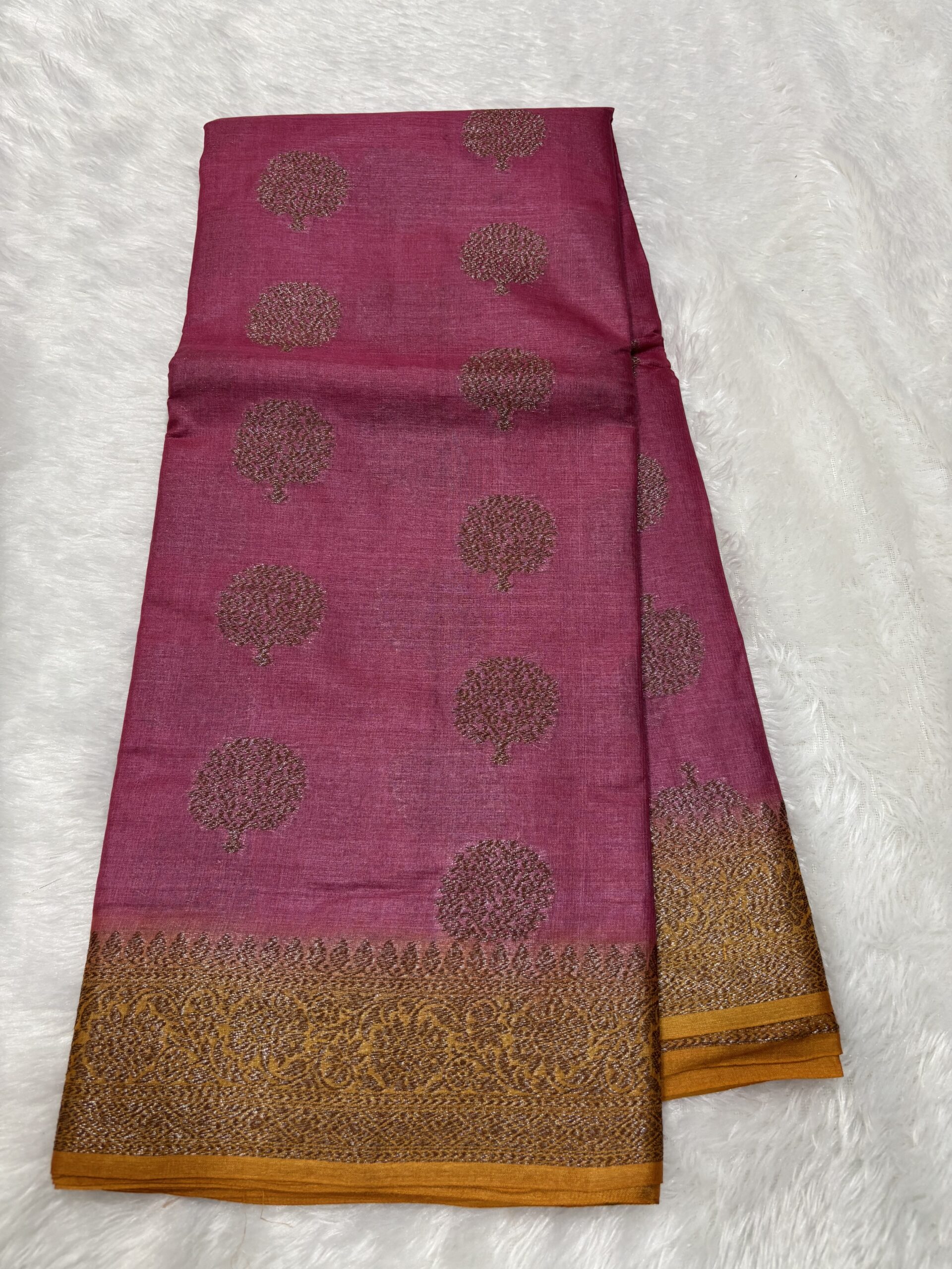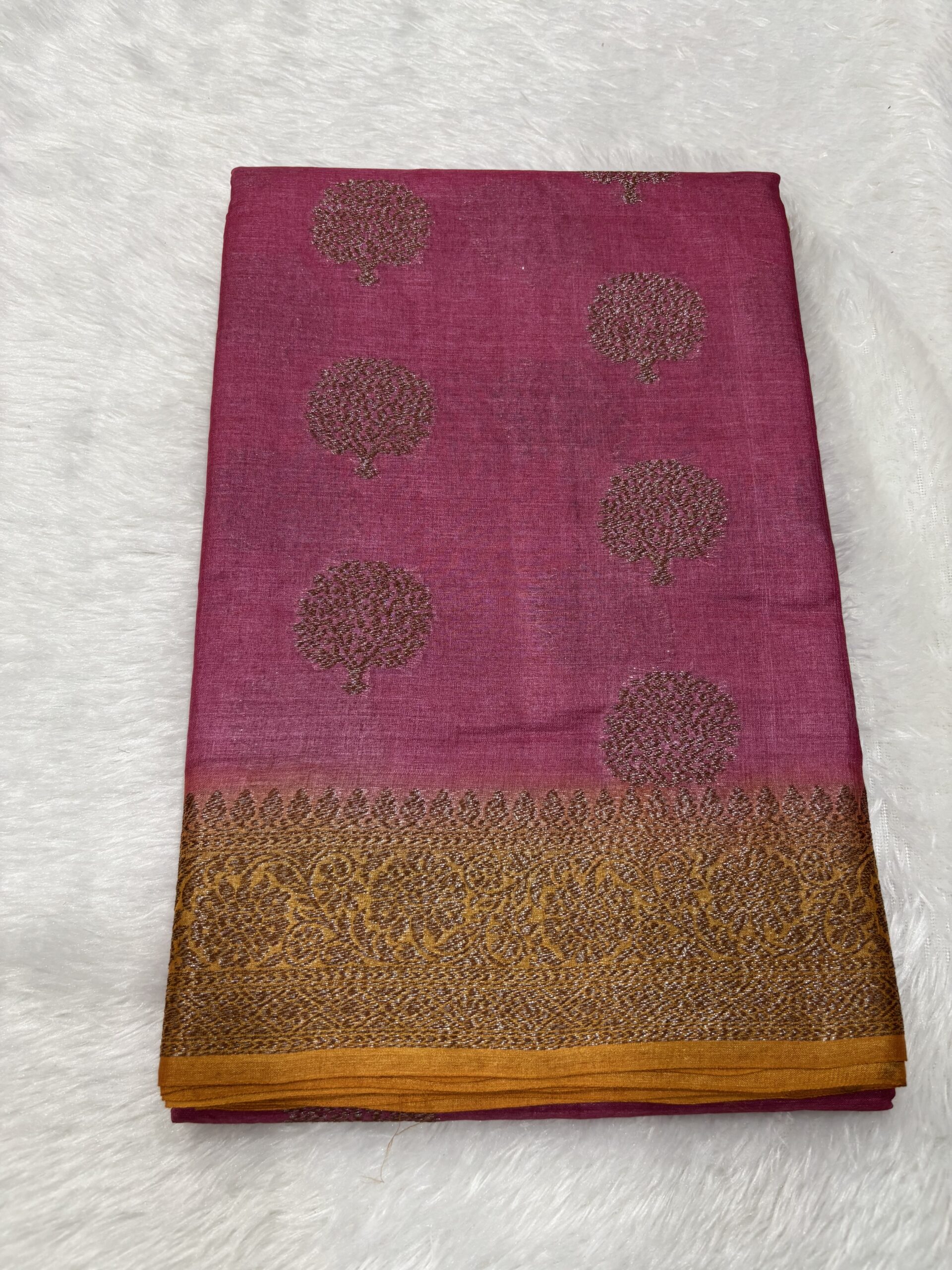 This Pure Tussar Pink & Mustard Contrast Banarasi Saree is designed for those who value both elegance and comfort. Its soft texture and refreshing shade make it the perfect choice for any season.