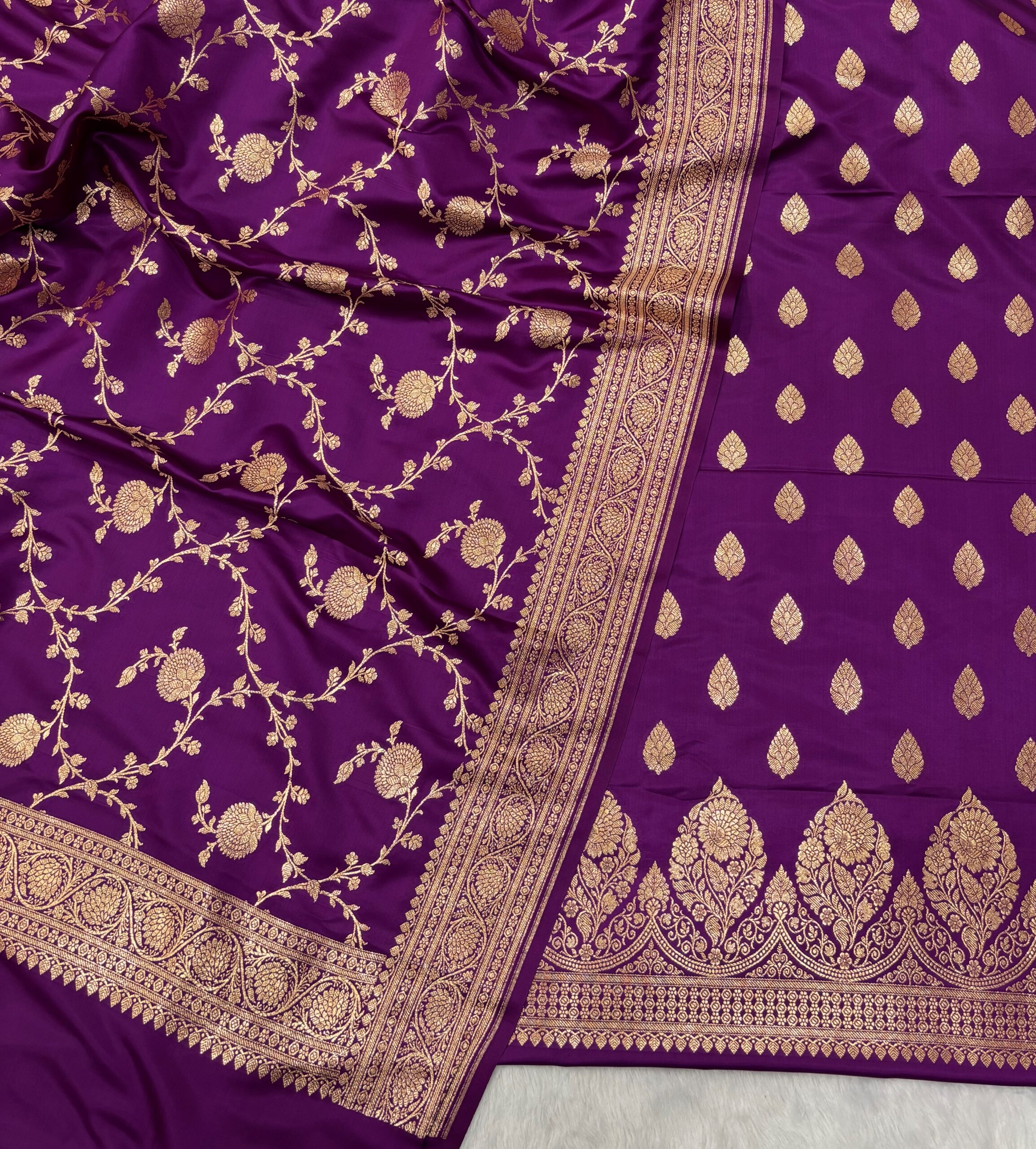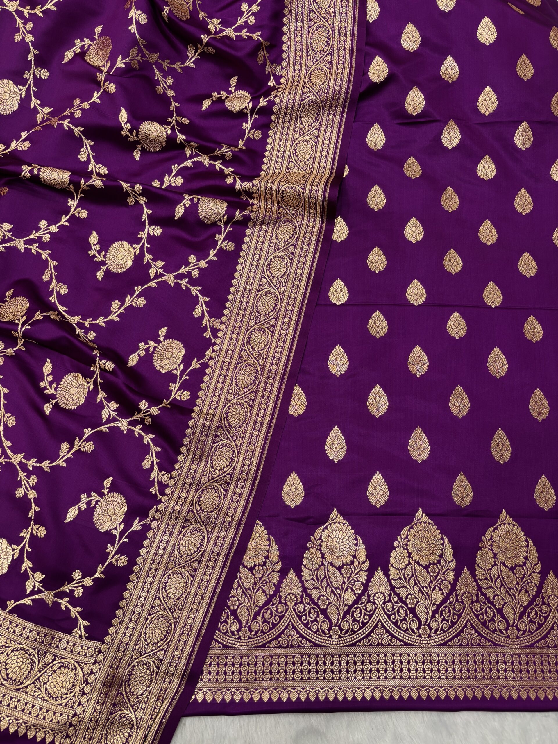 Elevate your ethnic grace with our Exclusive Purple Katan Silk Banarasi Suit, designed for those who appreciate the fine blend of tradition and luxury. This suit is crafted from high-quality Katan silk in a rich Purple Shade, offering a deep burgundy-toned hue that represents elegance and sophisticated style.