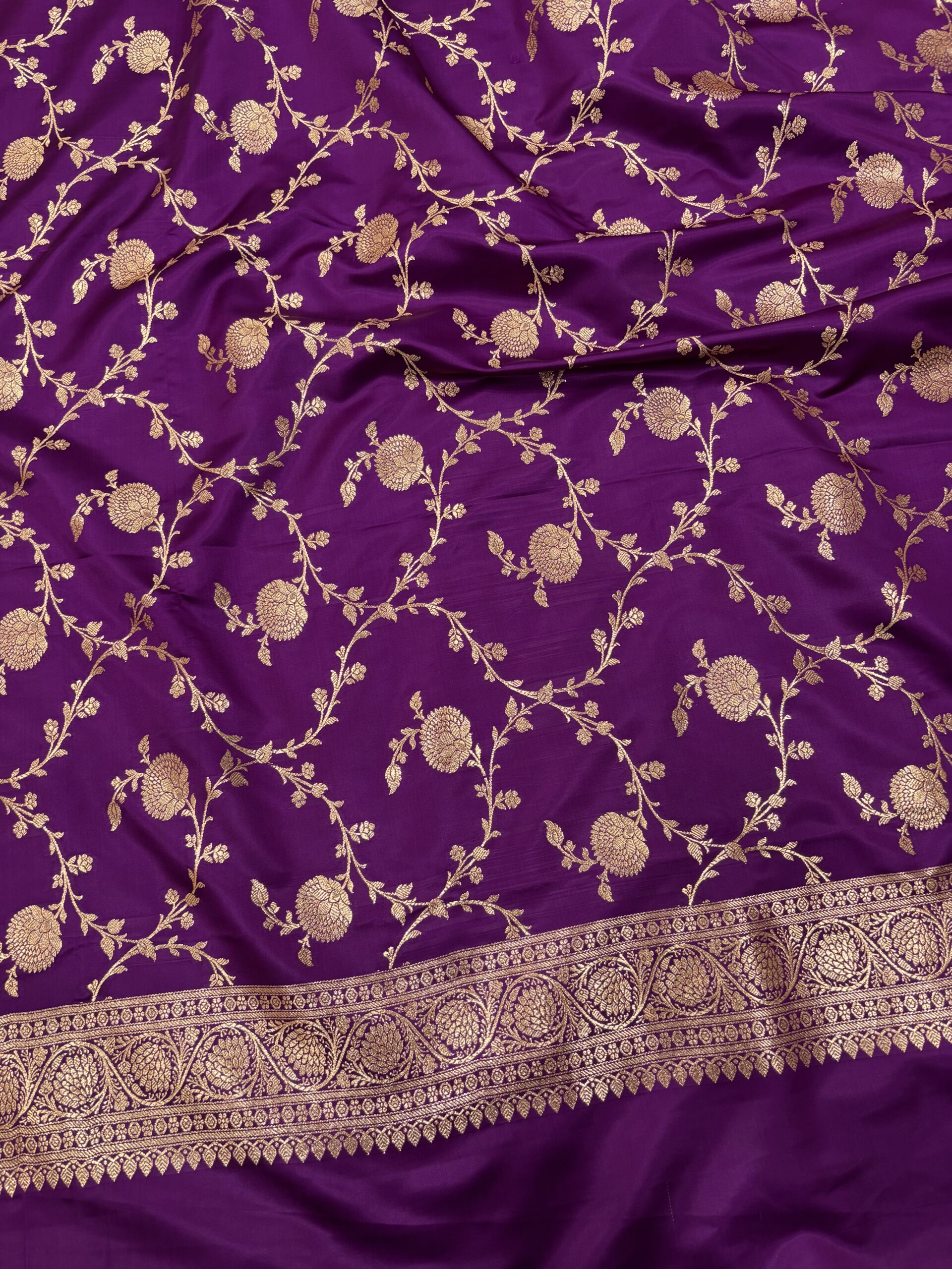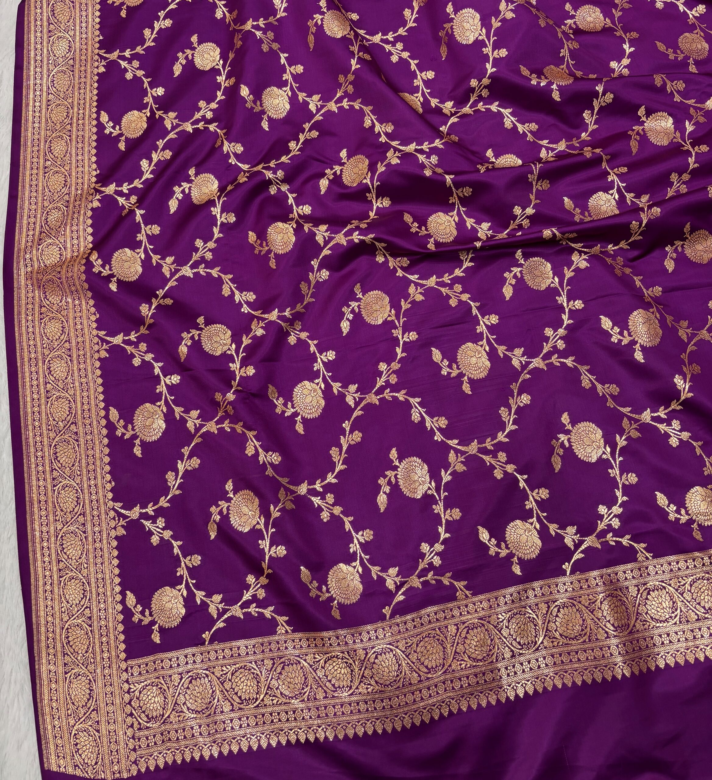 The glossy finish of the fabric enhances the depth of the color, making it an ideal choice for evening weddings, festivals, and grand celebrations. At Noori Handicrafts, we ensure the finest craftsmanship directly from the heritage looms of Varanasi.
