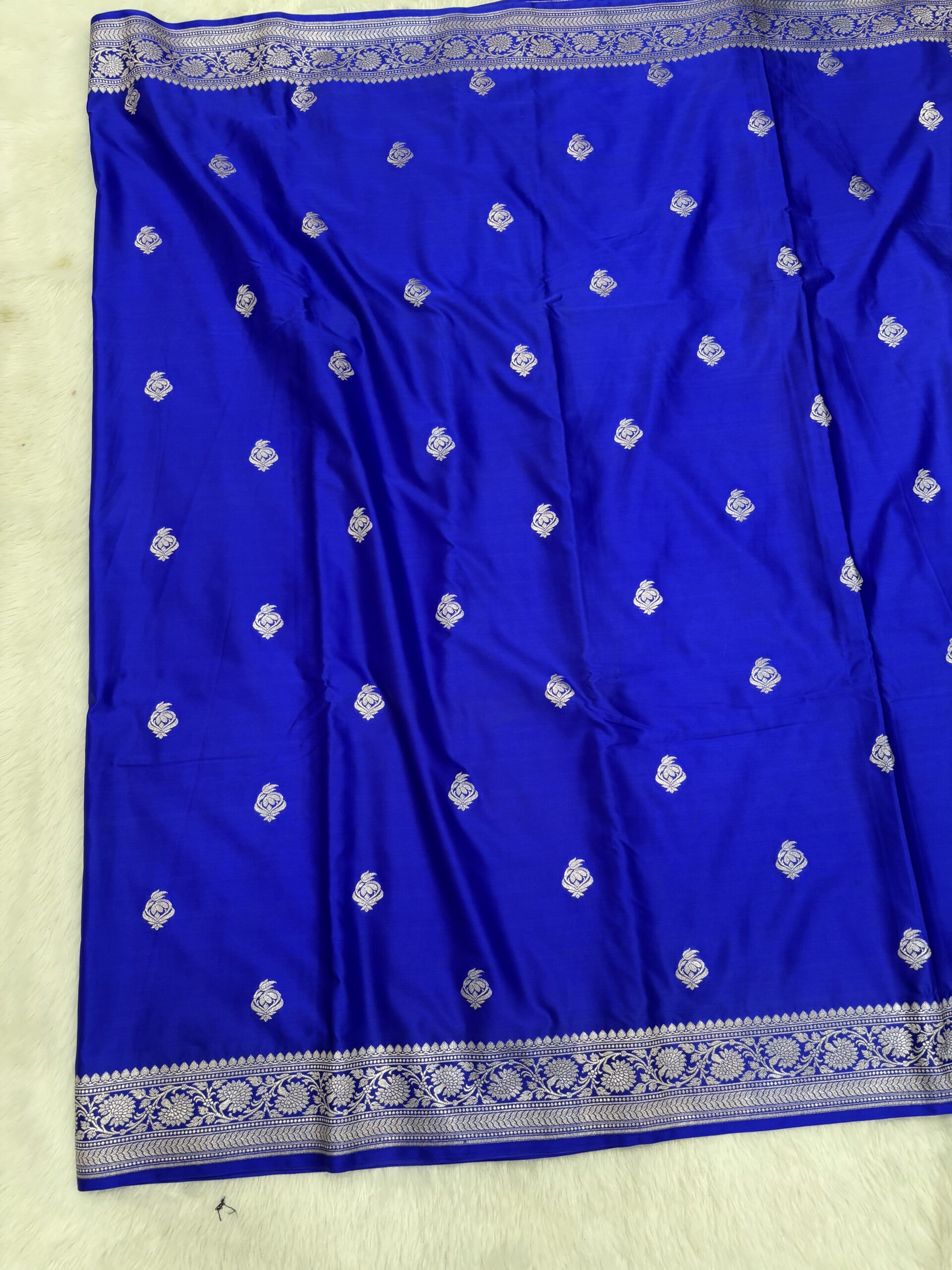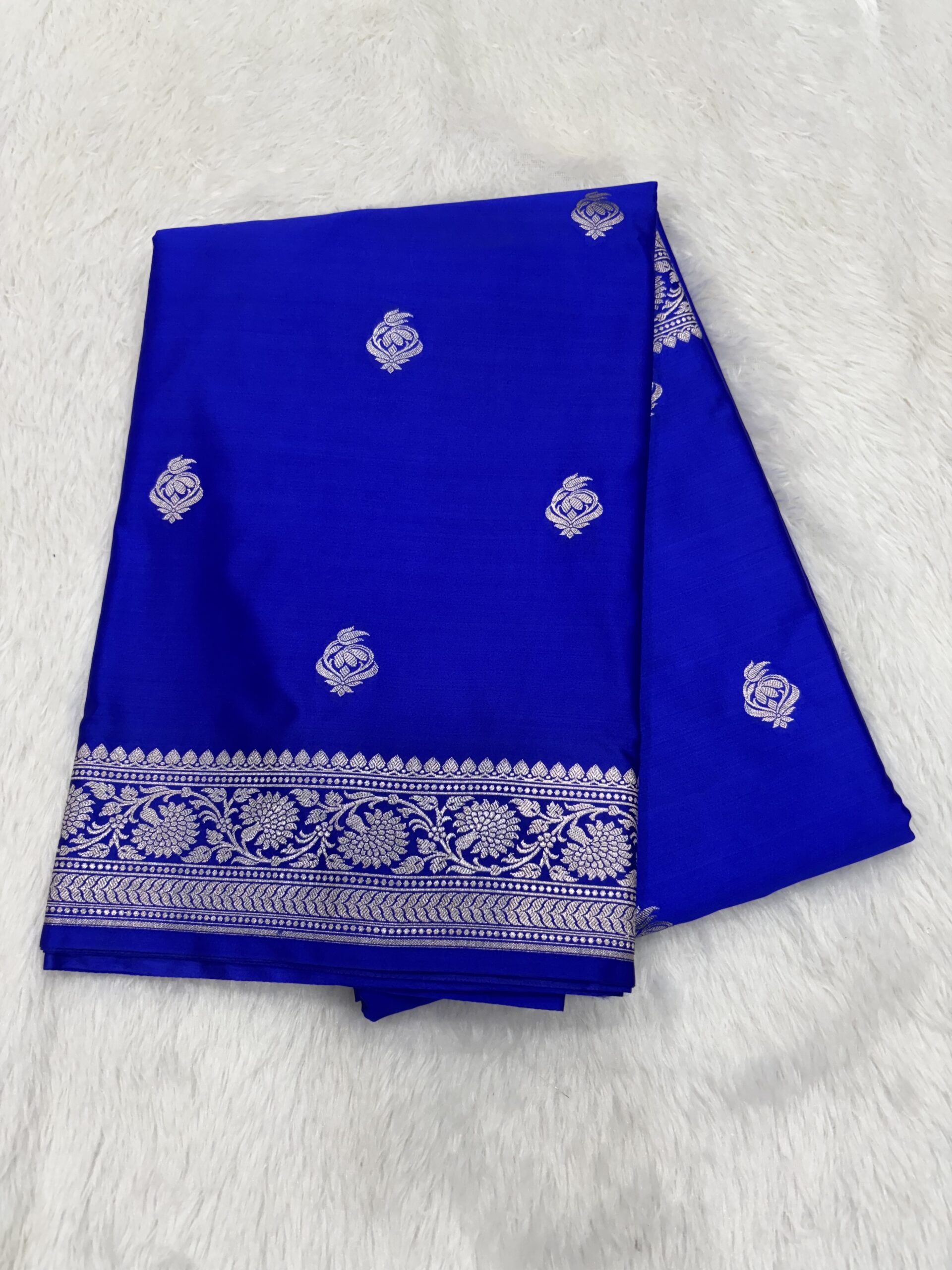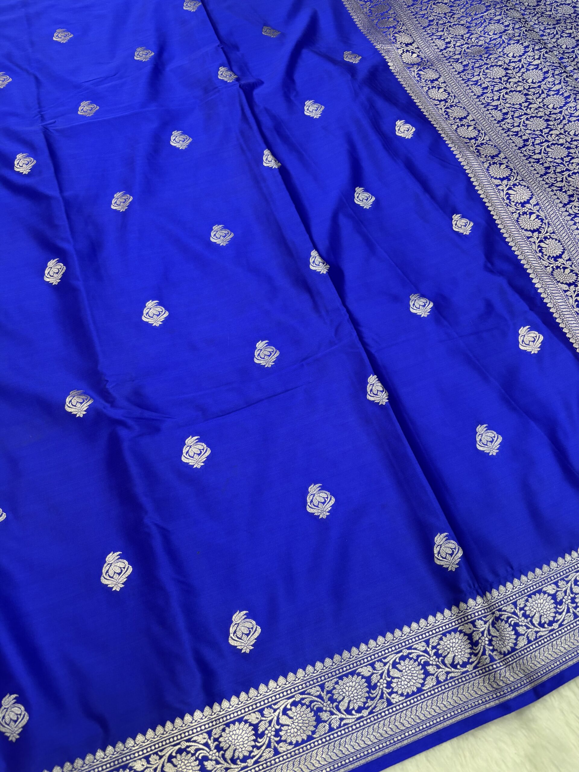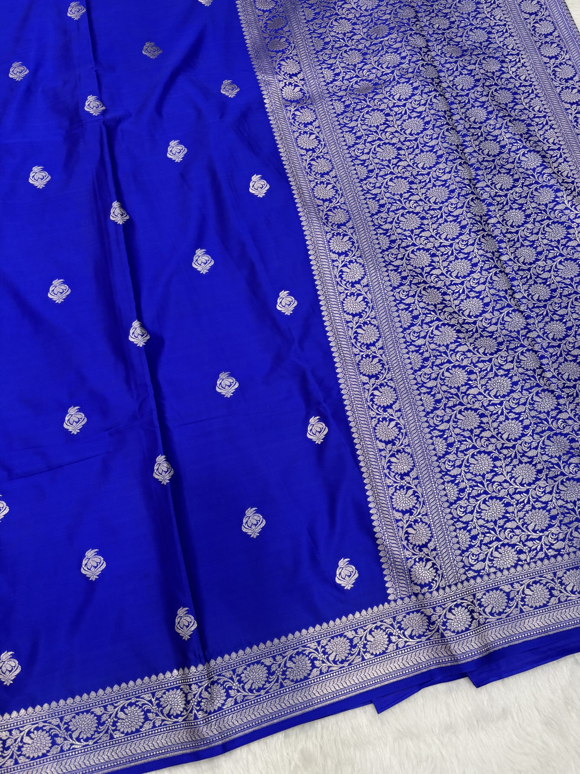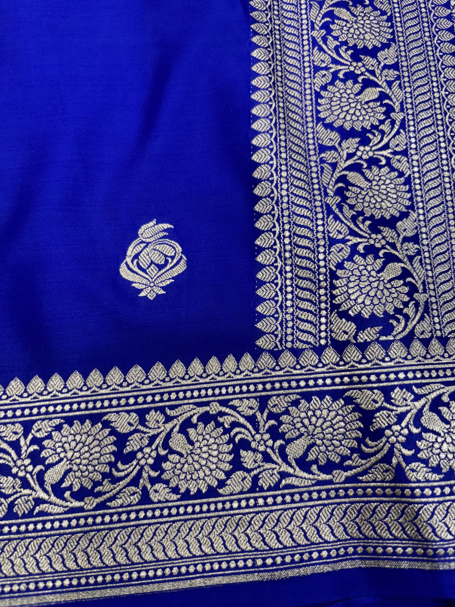 Rich Craftsmanship: This Royal Blue Banarasi Mashru Saree features intricate Zari motifs and a grand border that reflects the timeless art of Banaras.