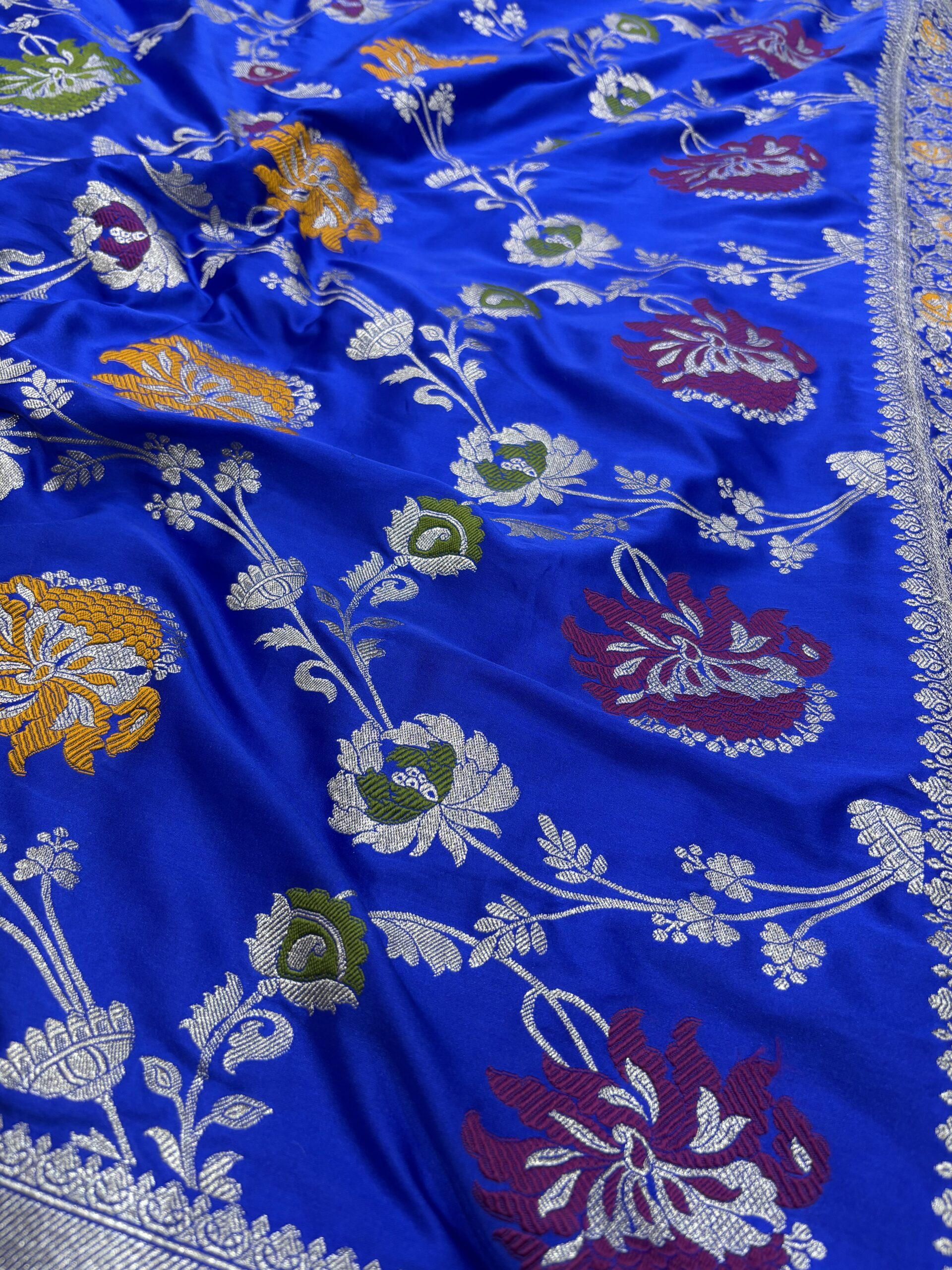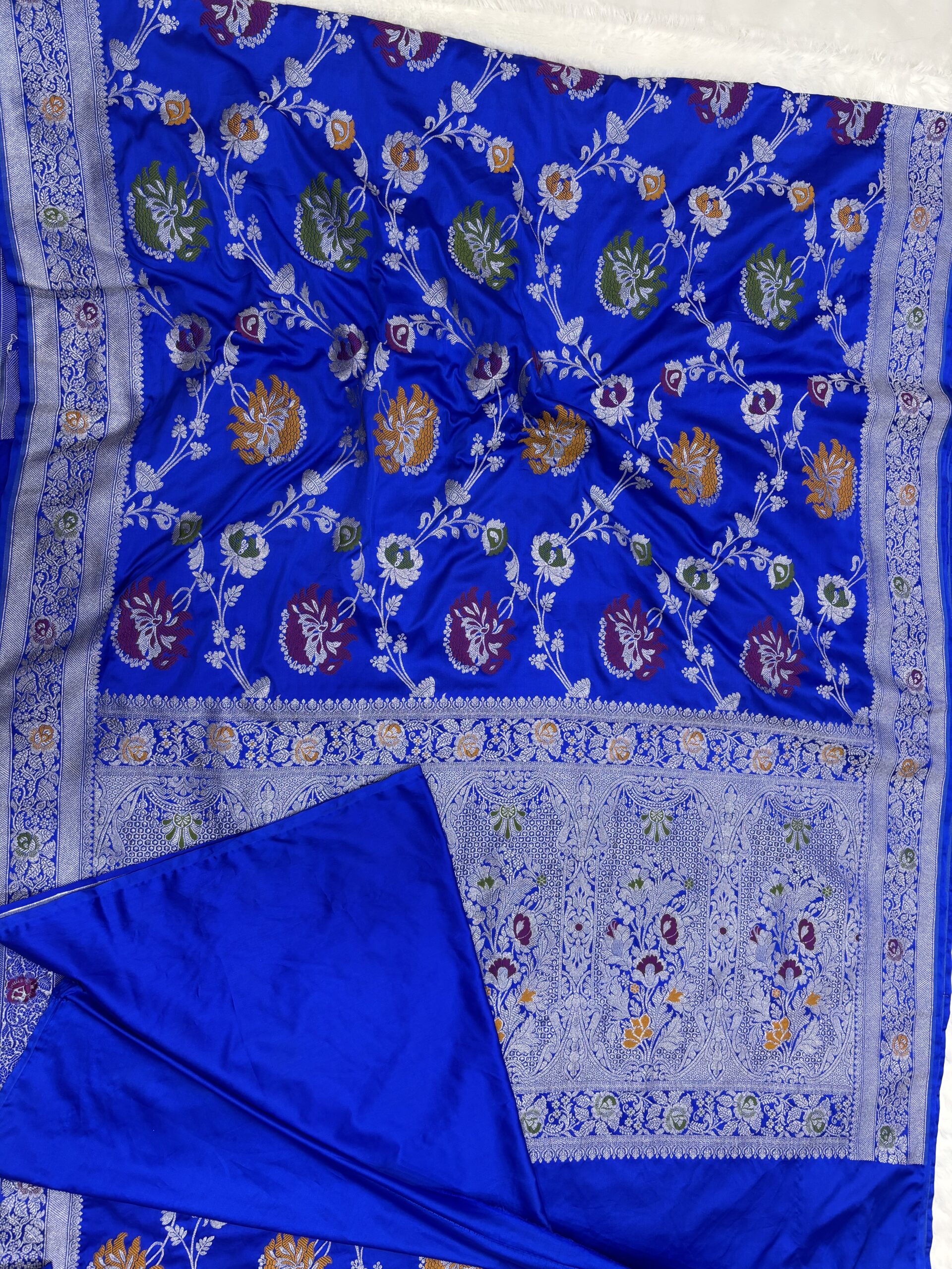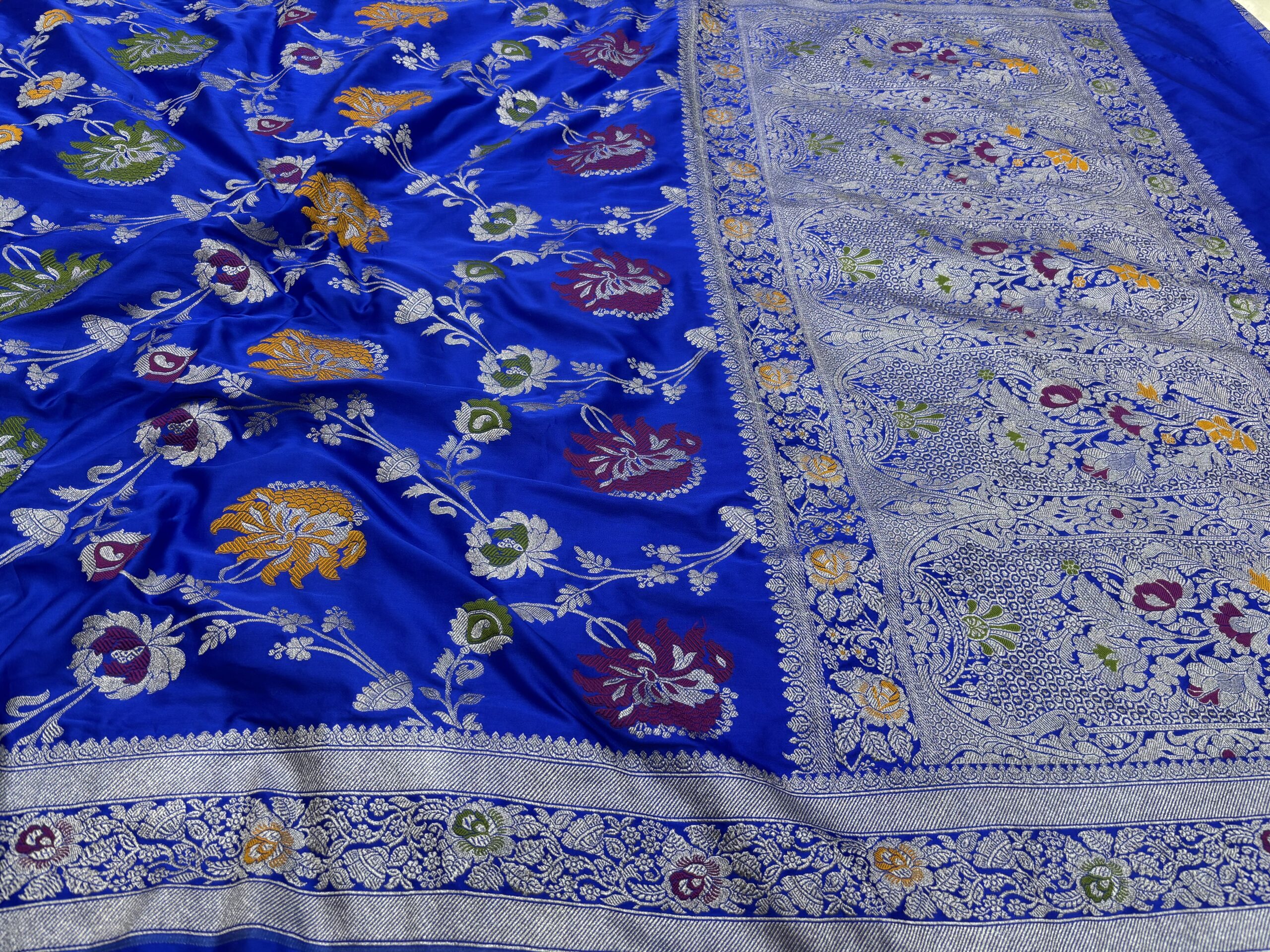Vibrant Meenakari Art: Features multi-colored floral weaving that creates a stunning contrast against the royal blue silk.