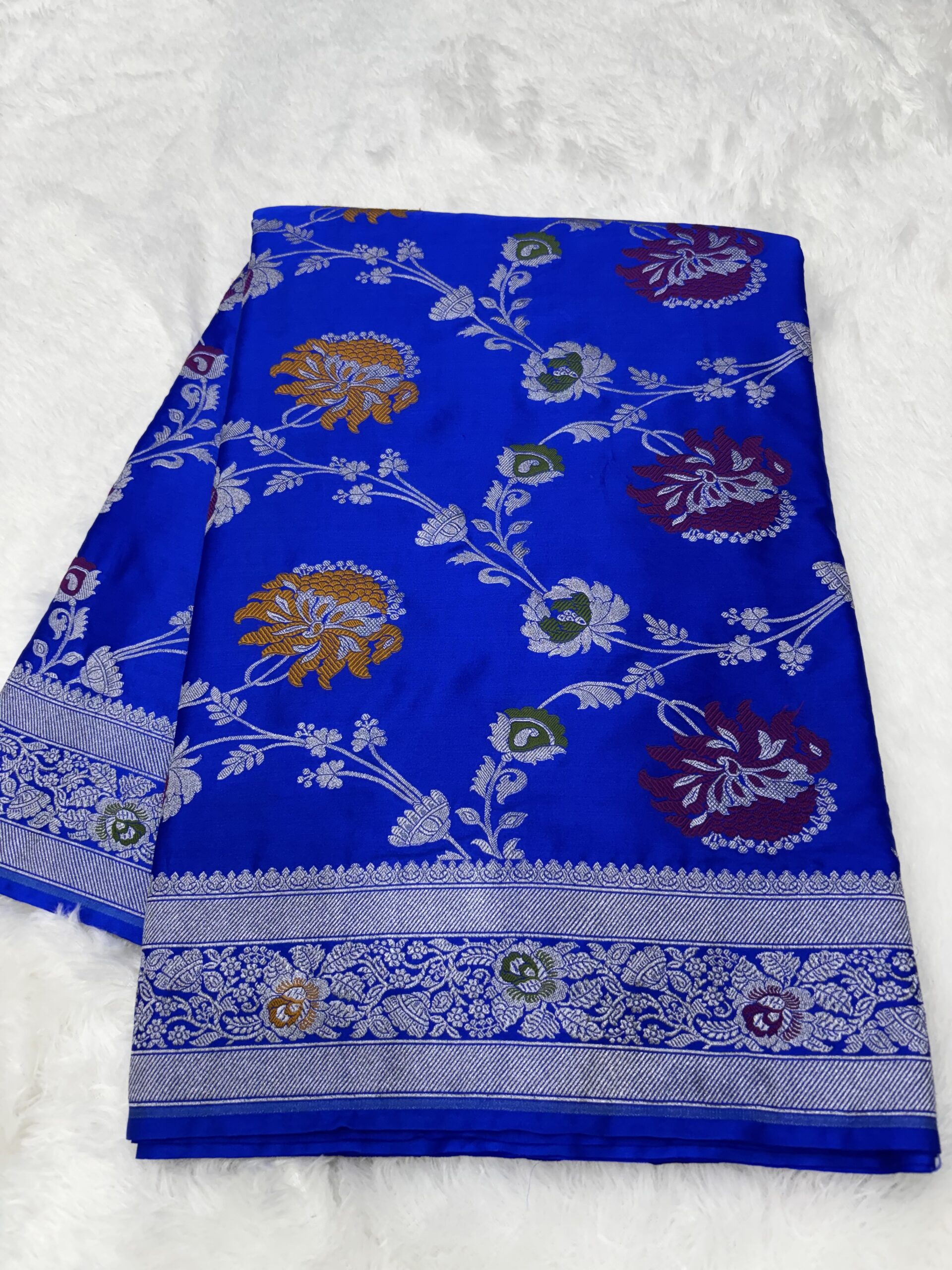 Experience the majestic beauty of our Royal Blue Meenakari Mashru Silk Saree, handcrafted with precision by Noori Handicrafts. This saree features a vibrant royal blue base adorned with intricate Meenakari floral patterns, showcasing the rich weaving heritage of Banaras. Made from authentic Mashru silk, it provides a luxurious satin glow .