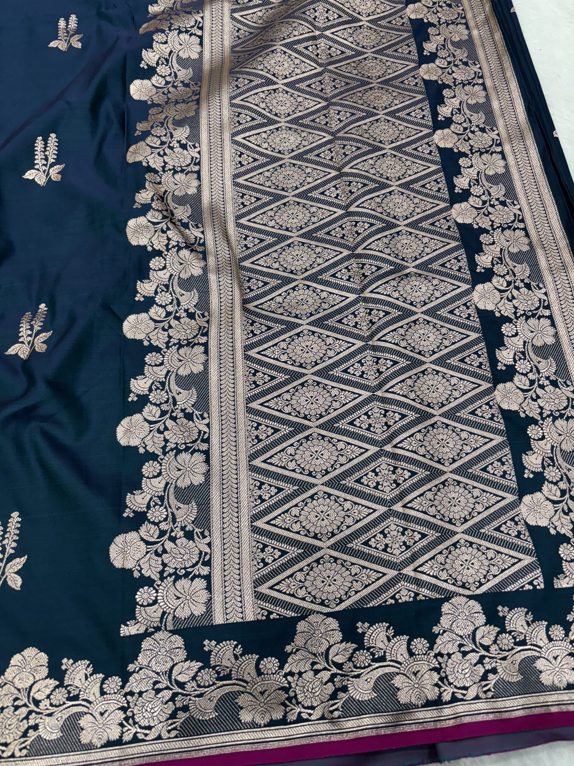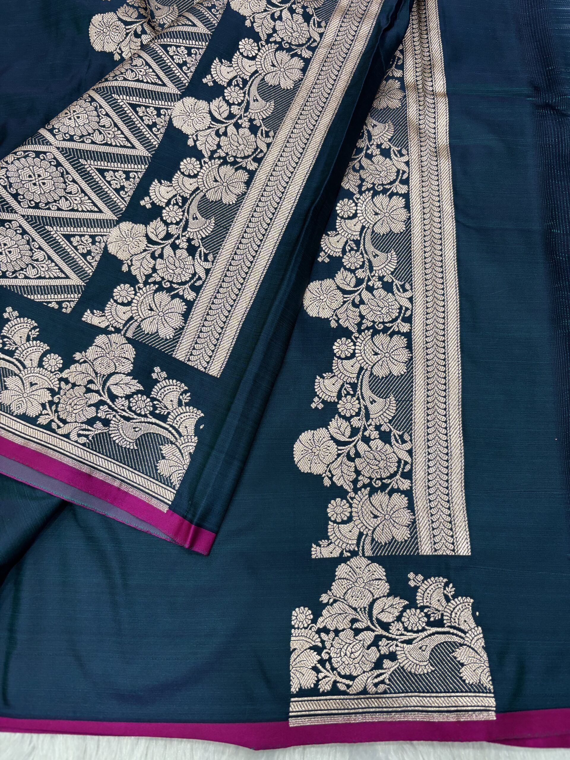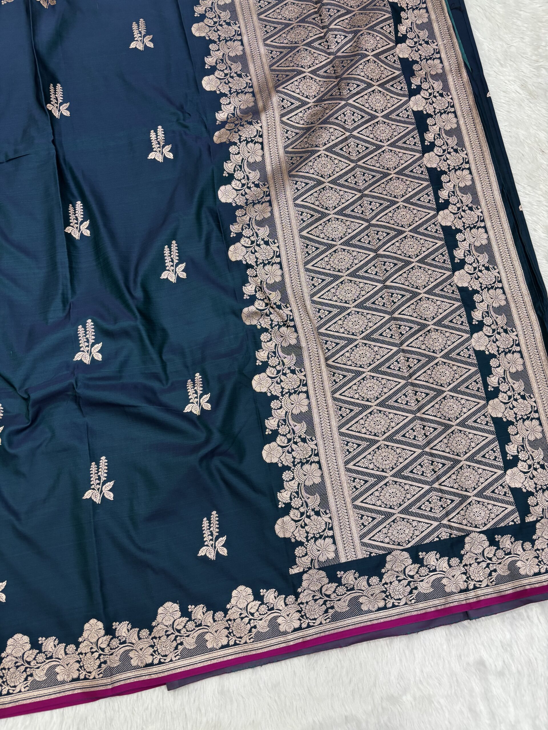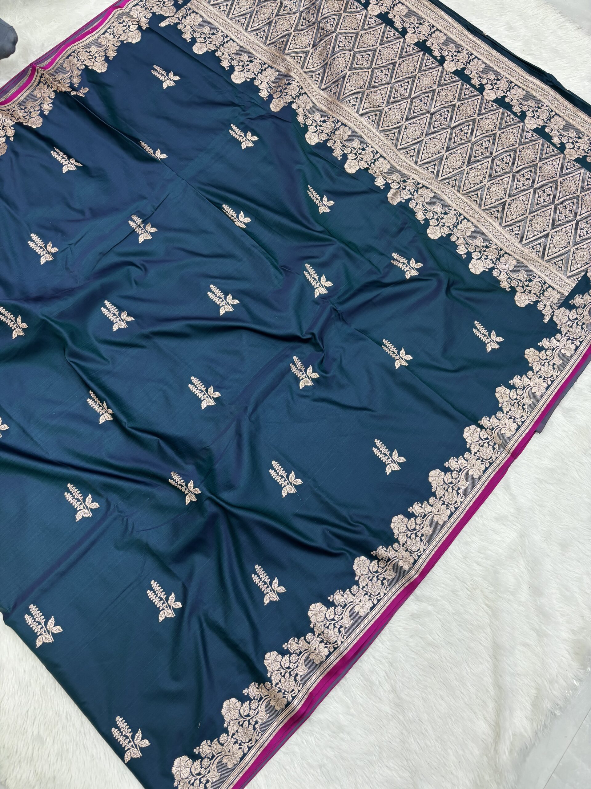 The Royal Mashru Satin Saree is unique because of its dual-layer weaving technique. While the top surface gives you a high-gloss silk finish, the underside is soft and breathable against the skin. This makes the Royal Shade Mashru Saree exceptionally comfortable for long wedding functions. The satin drape of this Royal Shade Banarasi Mashru Satin Saree is liquid-smooth, ensuring a perfect silhouette every time you wear it.